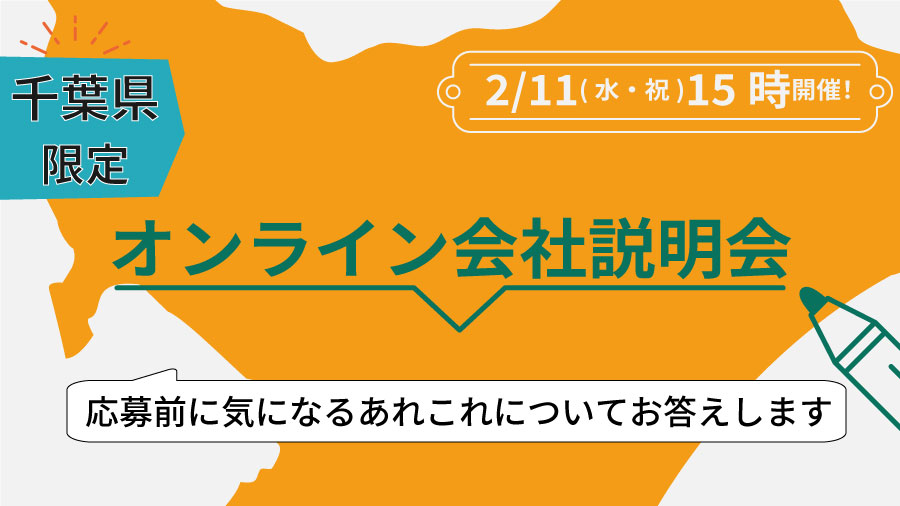 毎回、大変ご好評をいただいている会社説明会の千葉県限定版を開催することとなりました!応募前に気になるあれこれについてお答えします。求人応募を前提としたものではありませんので、お気軽にご参加ください。